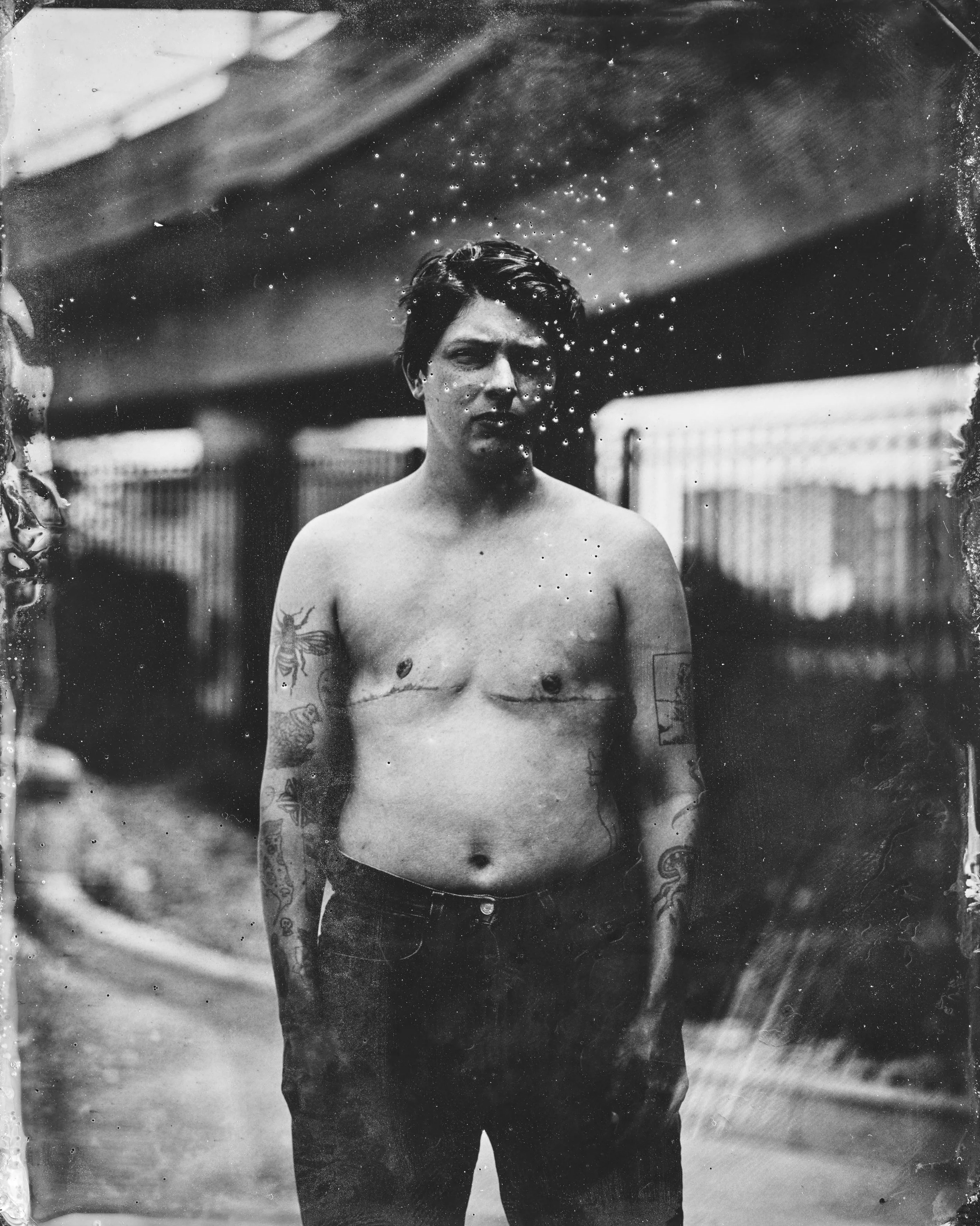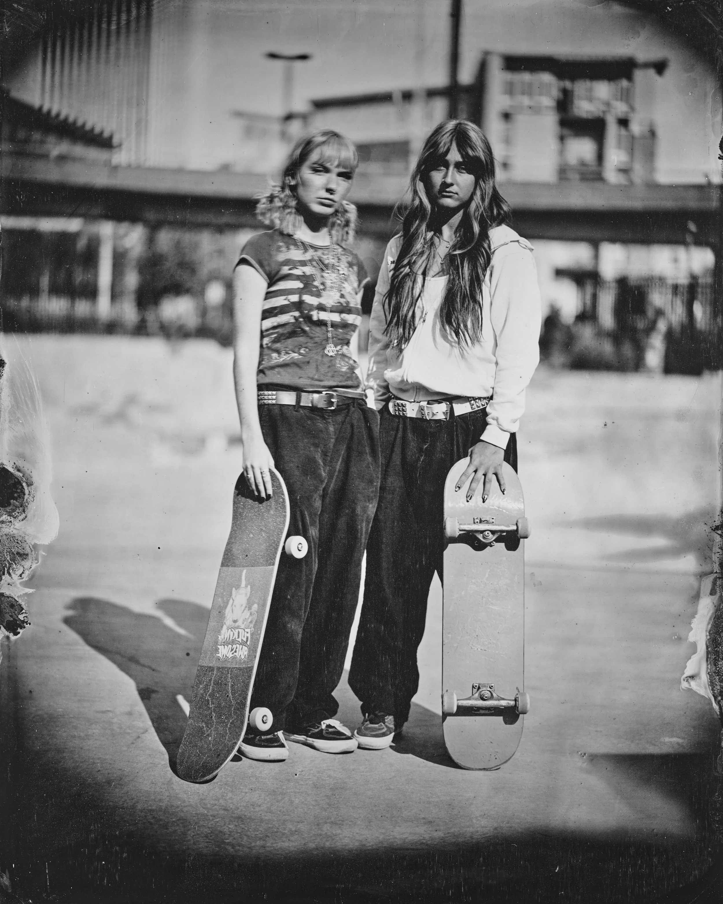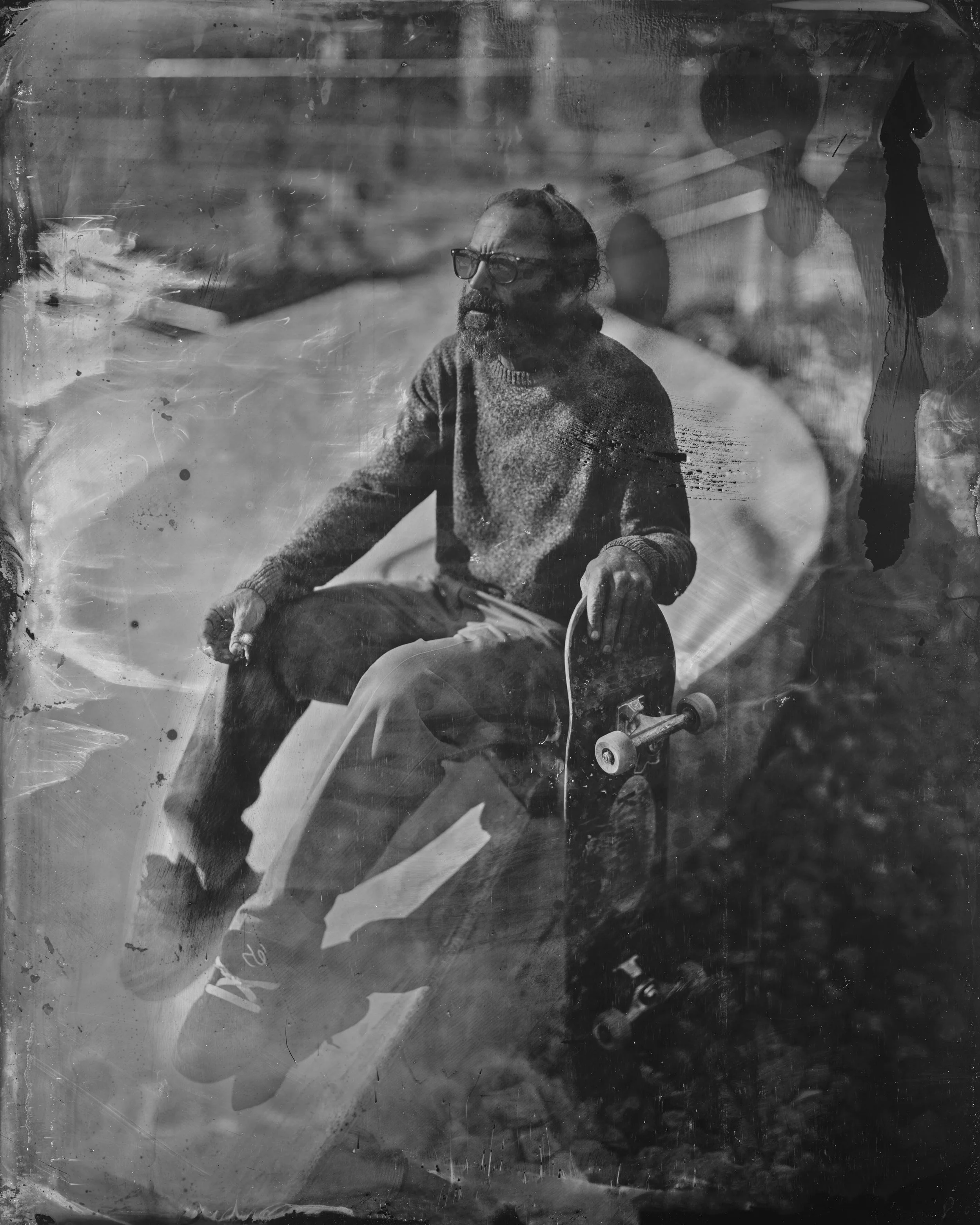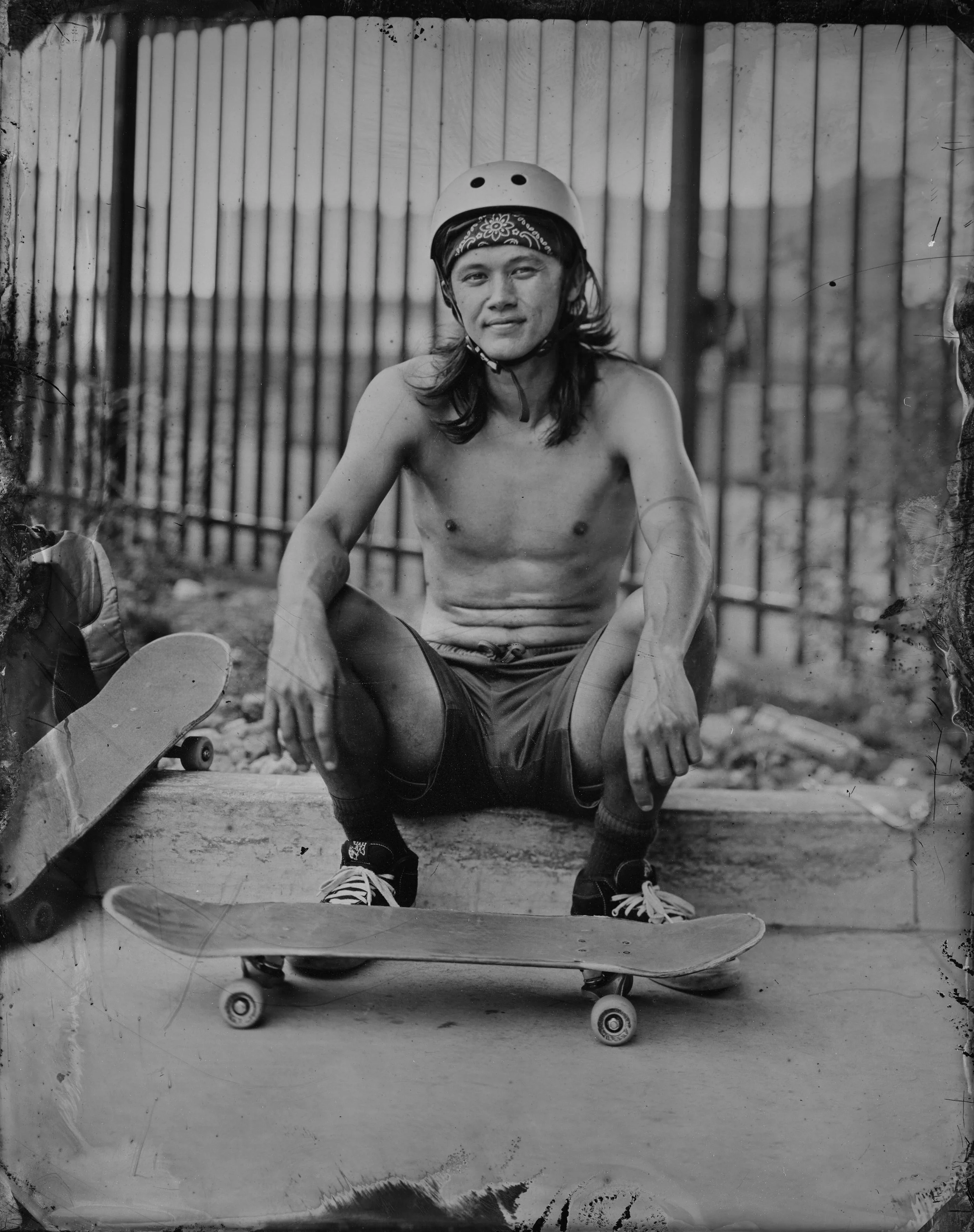 My tintype portraits and the skate park share a raw, gritty feel. The skaters’ faces and poses are like figures from the 1850s—rugged, facing life head-on. I worked on this for three years. Shot in real time. Skateboarding accepts falling. Every fall is part of growing. My work celebrates imperfection. The strength that comes from trying again. I got close to the skaters. Watched them fall and get up. They teach resilience.